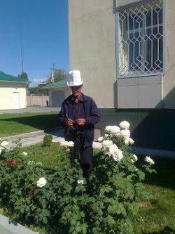 Улуттук Банктын Талас шаарындагы бөлүмүнүн имараты алдында гүл өстүрүүчү С.Ыбыкеев гүлдүн жети түрүн өстүрүп келет